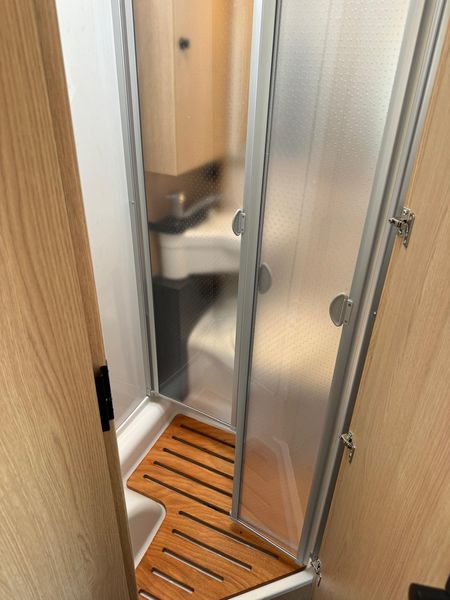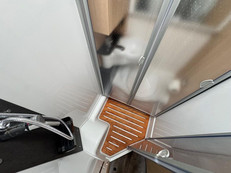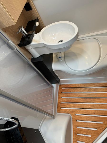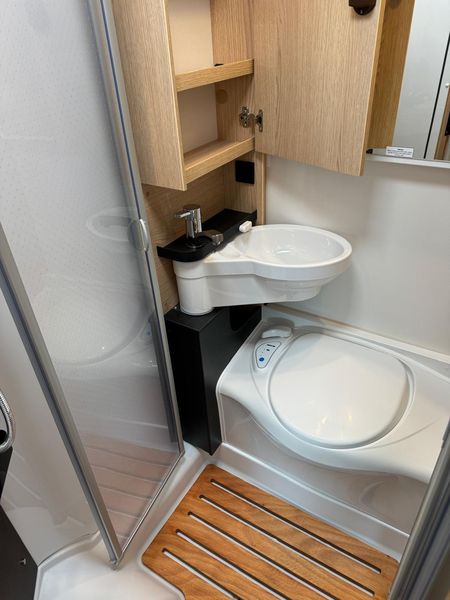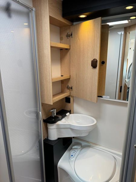 Il bagno completo è dotato di WC con cassetta estraibile per le acque nere e di doccia con acqua calda, per garantirti la massima autonomia e comfort ovunque tu sia.