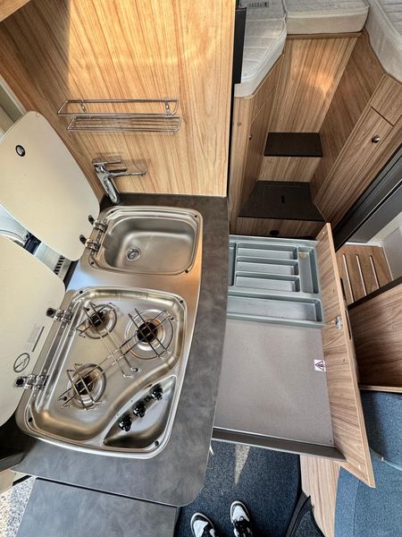 Solo 6,64 m di lunghezza, ma con 4 posti viaggio e 4 posti letto comodi e ben distribuiti.
