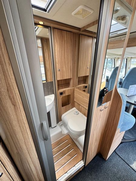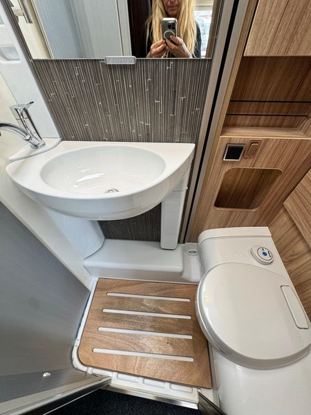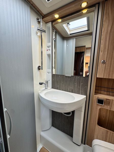 Bagno variabile HYMER, con parete girevole per creare una vera doccia separata.